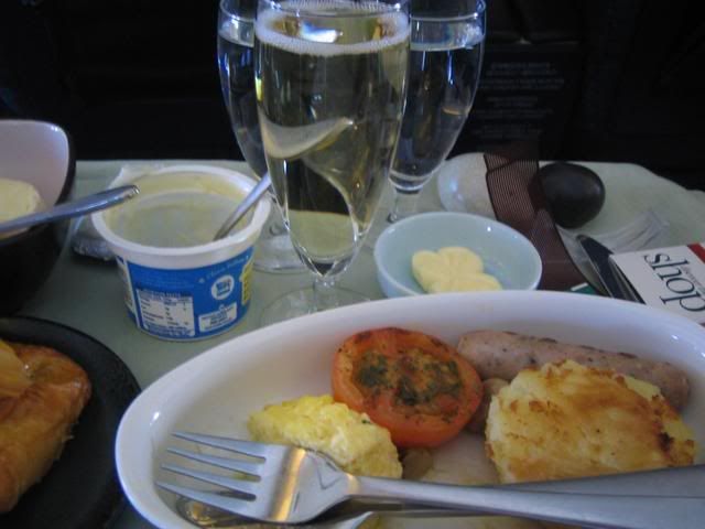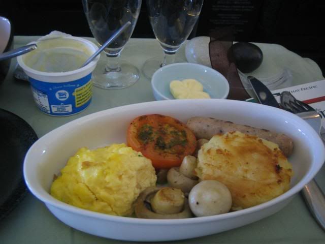 The breakfast post take off was a bit slow as service started from the back. Went for the scrambled eggs yet again, and the v nice FA remembered that I'd requested for champagne as a glass was brought to me. Nothing like champagne to wash it all down. Oh and Cathay has great garlic bread - possibly the best on any airline. It was crispy, not soggy which is common on other carriers - and they've got the blend of flavours right.