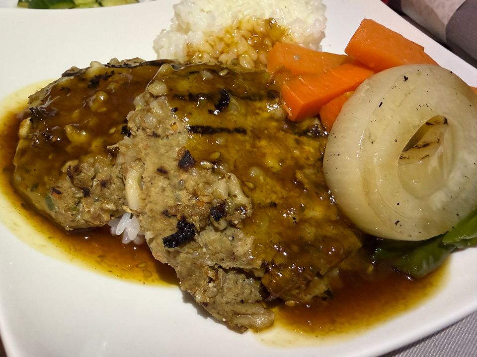 Tteokgalbi (Korean Beef Patties) with Steamed White Rice and Korean Miso and Cabbage Soup